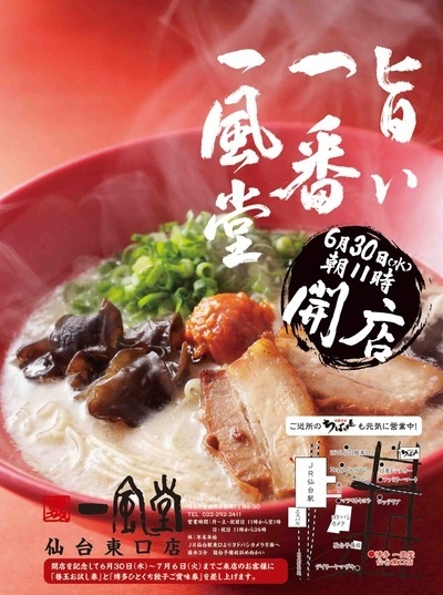 6/30(水)、仙台駅東口に仙台2号店目となる「博多 一風堂 仙台東口店」を開店いたします。 博多の熱い風を吹かせていけるよう一生懸命頑張りますので、これからもなにとぞよろしく お願いいたします。お近くにお寄りの際はぜひ一度ご来店ください。 スタッフ一同、心よりお待ち申し上げております。 【博多 一風堂 仙台東口店】 〒983-0852 仙台市宮城野区榴岡1丁目6-30 電話 022-292-2411 営業時間 : 月〜土曜・祝前日 11時から翌1時 日・祝日 11時から24時 席数:39席 休:年末年始