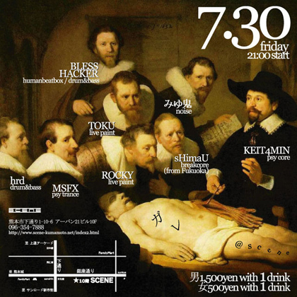 ¥¬¥ì¡÷·§ËÜ 2010ǯ7·î30Æü(¶â)¡÷SCENE ·§ËÜ 22:00 Start Fee ÃË : 1500yen(w 1D) ½÷ : 500yen(w 1D) ¢¨¥·¥Ã¥«¥ê¤·¤¿¥³¥¹¥×¥ì¤ÎÊý¤Ë¤Ï¥ï¥ó¥É¥ê¥ó¥¯¥µ¡¼¥Ó¥¹Í¤ê¥Þ¥¹ [live ¡õ dj] sHimaU (CR pachincore) (http://www.myspace.com/shimau) onomatopeee (Anicore) (http://www.myspace.com/onomatopeee) keit4min (Psycore) (http://www.myspace.com/keit4min) BLESS HACKER (Human Beatbox) hrd (drum¡Çn Bass) MSFX (Dark Psy) ¤ß¤æµ´ (Noise) [live paint] Rocky TOKU gama [¾ì½ê] SCENE (·§Ëܸ©·§ËܻԲ¼ÄÌ1¡Ý10¡Ý6¶äºÂ