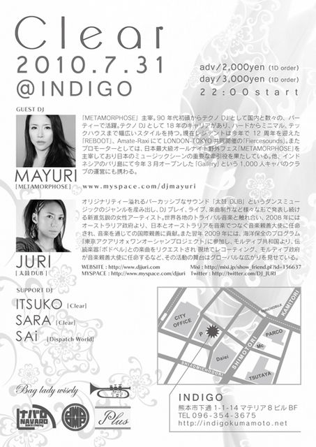 ¢£date: 2010.07.31(SAT) ¢£title: clear ¢£venue: INDIGO ·§ËܻԲÖȪĮ1-3BF http://www1.biz.biglobe.ne.jp 096-355-2654 ¢£entrance: adv:2,000yen(1D order) day:3,000yen(1D order) ¢£open: 22:00 ¢£guest dj: DJ MAYURI(MEATAMORPHOSE) DJ JURI(ÂÀ¸ÝDUB) ¢£support dj: ITSUKO(Clear) SARA(Clear) SAi(Dispattch World)