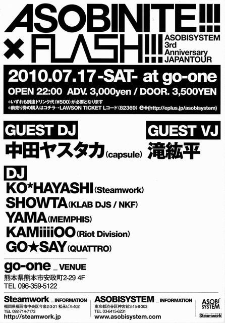 ´ÉÍý¿ÍÍ͹ðÃμºÎ餷¤Þ¤¹ ¡¡Perfume¤Î¥×¥í¥Ç¥å¡¼¥µ¡¼¡¢capsule¤ÇƱ¤¸¤ß¤ÎÃæÅĥ䥹¥¿¥«»á½éÍè·§¤Ç¤¹¡£ °Ê²¼¾ÜºÙ¡¢ 2010.07.17 SAT 22:00 OPEN ASOBINITE!!! ¡ß FLASH!!! -ASOBISYSTEM 3rd Anniversary JAPAN TOUR in KUMAMOTO- AT¡§go-one ¢£ PRICE¡§ADV \3000 / DOOR \3500 ¡ö¤¤¤º¤ì¤âÊÌÅӥɥê¥ó¥¯Âå¡Ê\500¡Ë¤¬É¬ÍפȤʤê¤Þ¤¹¡£ Á°Çä¤ê·ô¤Î¹ØÆþ¤Ï¥³¥Á¥é LAWSON TICKET L¥³¡¼¥É¡Ê82369¡Ë ¢£ GUEST DJ¡§ÃæÅĥ䥹¥¿¥«¡Êcapsule¡Ë ¢£ DJ¡§KO*HAYASHI¡ÊSteamwork¡Ë / SHOWTA( KLAB DJS / NKF ) /