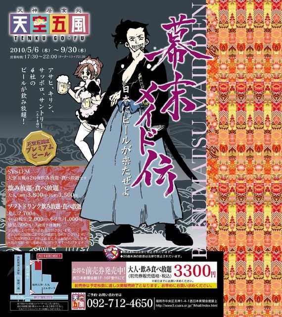 今年は『幕末メイドビヤガーデン』だよ! 18:45 天神三越前ライオン広場集合 19時〜21時 『天空五風』で2時間食べ飲み放題! 料金:3300円(前売料金) ※(アルコール飲まない人は2700円なので必ず参加表明に書いてください!) ※雨天中止です。 前日に天気予報を確認の上、前売券買ってきます。 ※満席の場合は参加をお断りすることがあります。早めの参加表明をお願いします。。 屋外の開放感を味わいながら、楽しく飲みましょう! よろしくお願いします