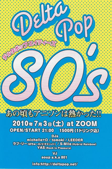 デルタポップエクスタシー、デルタポップロボネイションに続く デルタポップスピンオフ企画第三弾!! その名もデルタポップ80’s!!! 80年代のアニメソングオンリーのイベントです 80年代はアニソンの宝庫 ドラゴンボールや聖闘士星矢などジャンプ黄金期 藤子不二雄ワイド ナウシカ・ラピュタ★ジブリ系 ぴえろ魔法少女 タッチ・うる星★サンデーも! ハウス系まで!! 普段アニソンイベントにあまり遊びに行かない人も デルタポップやアニソンが大好きな人も リ