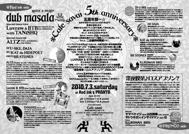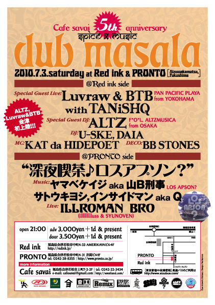 告知失礼いたします。 7/3は会津若松に大集合!! Cafe Savaiのメデタイ5周年祭です!!! 今回はREDINKとPRONTOの2店舗での同時開催! REDINKでは、LUVRAW &BTB feat. TANiSHQのライブもあります。 ↓これは以前のライブの模様です。 お近くの方はもちろん遠くの方も皆で遊びましょ〜!!! Cafe savai 5th anniversary spice×music dub masala 五周年祭〜☆ おかげさまでCafe savaiは7月4日で五周年を迎えます。 皆様の支えがあってここまで成長して来れました。 誠にありがとうございます!! そして、