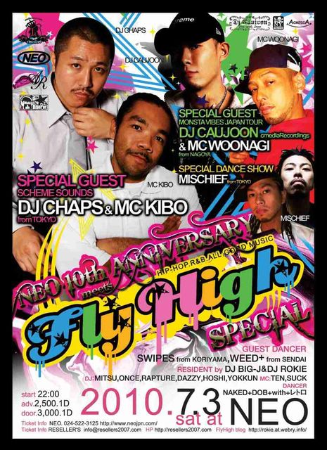 貴重なスペース、 書き込み失礼致します。 不適切でしたら削除の方、宜しくお願い致します。 (パーティー詳細) http://www.neojpn.com/?m=20100703&cat=2 2010年7月3日(土) Fly High @ NEO(福島県福島市) オープン 10pm 前売り2500円 当日3000円 SPECIAL GUEST: DJ CHAPS & MC KIBO (from TOKYO) DJ CAUJOON & MC WOONAGI (from NAGOYA) SPECIAL DANCE SHOW: MISCHIEF(from TOKYO) GUEST DANCER: SWIPES(from KORIYAMA), WEED+(from SENDAI) RESIDENT DJ: BIG-J&DJ ROKIE DJ: MITSU、ONCE, RAPTURE, DAZZY,