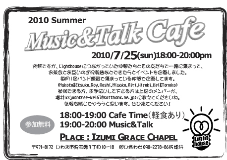 突然ですが、lighthouseにつながっていた仲間たちと その友だちで一緒に集まって お茶会とお互いの近況報告などをできたらとイベントを企画しました。 毎月1回集まっているバンドのメンバーで企画しました。 (Makoto&Etsuko,Roy,Hoshi,Miwako,Airi,Hiroki,Kei&Tomoko) 気楽な感じでやろうと思います。 ぜひ、来てくださいね! 参加してくださる方、お手伝いしてくださる方は、Kまで連絡ください。 *チラシ参照
