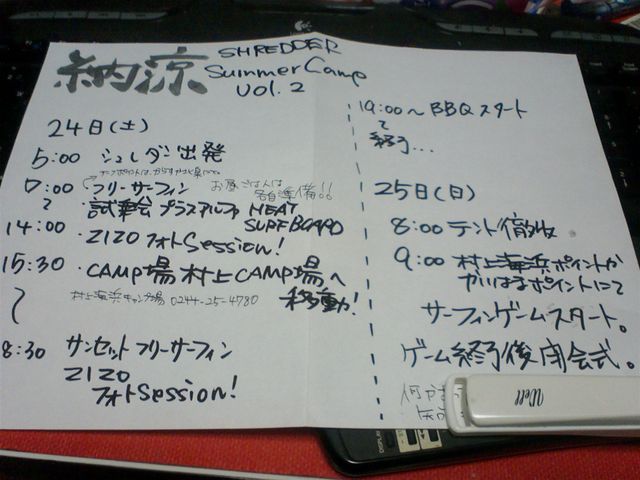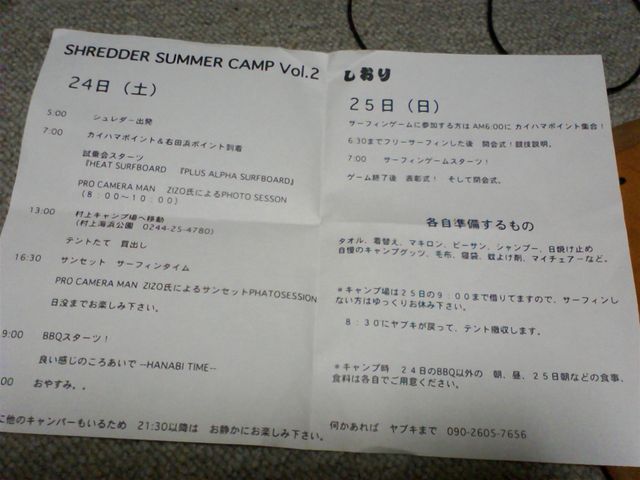 泊まる場所はテントor車泊 シュレダーの都合により詳細ちょこちょこ変更しております。 会費3000円(24日夜食の食費やお酒等) 会費は当日まっつぁんへ(俺) 詳細 24日 サーフィンやりたい人 5:00 シュレダー集合 7:00〜 フリーサーフィン&試乗会 8:00〜 zizoフォトセッション サーフィンやらない人(エイト) 8:00 森さん家集合(予定) (タークンは一度俺ん家来てね!by荷物) 10:00〜 フリーSk8 合同 13:00〜 村上CAMP場へ(? 0244-25