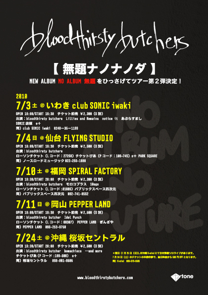 2010年7月3日(土) @いわき club SONIC iwaki OPEN 18:00/START 18:30 出演:bloodthirsty butchers、Lillies and Remains、notice it、あぶらすまし チケット 前売 ¥2,300(1D別) チケット取扱い SONIC店頭 e+ 問)club SONIC iwaki 0246−35−1199 2010年7月4日(日) @仙台 FLYING STUDIO OPEN 18:00/START 18:30 出演:bloodthirsty butchers チケット 前売 ¥2,500(1D別・入場整理番号付) チケット取扱い ローソンチケット(Lコード:27258) チケットぴあ(Pコード:109-745) e+ PARK SQUARE(TEL: 022-26