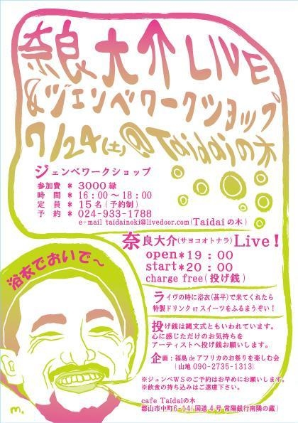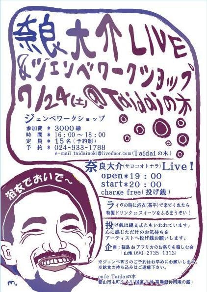 ジェンベ練習会@Taidaiの木特別企画 またまたサヨコオトナラの奈良さん! 今月2度目の来郡です。 夜は奈良大介投げ銭ライブ! 踊って歌って叩いて遊びましょう! 夏祭りです。浴衣でおいでまし。 浴衣の方にはタイダイ特製ドリンク or スィーツ振舞っちゃいます。 皆さんよろしくね。 ============以下詳細=============== 7/24(土) 奈良大介(サヨコオトナラ)Live & ジェンベワークショップ@Taidaiの木 ☆ジェンベワークショップ 参加費 3000縁 時間 16:00〜18:00 定員 15名(予約制)