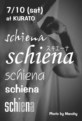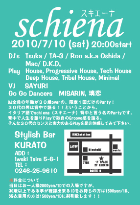 告知失礼致します。 Schiena 〜スキエーナ〜 ◆日時…7月10日(土) START 20:00〜 ◆料金…2000yen/1D ※30歳以上である事が確認出来るIDをお持ちの方1500yen/1D ※浴衣着用の方1500yen/1D ◆DJ's… Tsuka / TA-3 / Roo a.k.a Oshida / Mac / D.K.D。 ◆VJ… SAYURI ◆Go Go Dancers MISARIN,璃恋 ◆コンセプト…1回限りのDJ全員が30over Party!30代の男は背中で語るという事から、イタリア語でschiena(スキエーナ)「背中」という名のPartyです。 背中で人生を語り、Playで独自のGroove感を語るそんな3
