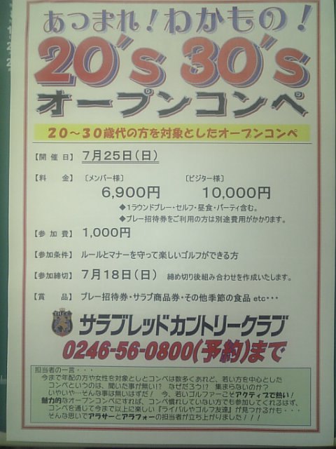 【料 金】 〔メンバー様〕 6,900円 〔ビジター様〕10,000円 ◆1ラウンド・セルフ・昼食・パーティ含む。 【参加費】 1,000円 【参加条件】 ルール・マナーを守って楽しいゴルフが出来る方 【参加締切り】7月18日(日) 締切り後組合せを作成致します。 【賞品】プレー招待券・サラブ賞品券・その他季節の食品etc・・・ サラブ発信の新しいコンペです 同世代の方と交流を持って、お友だちを作られてみては? 皆さま奮ってご参加下さい