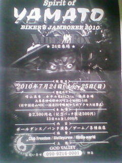 【企画者】:GOD VALLEY 第4回 Spirit Of Yamato Biker's Jamboree 開催日時: 2009年7月24日(土)〜25日(日) 開催場所: 兵庫県神崎郡神崎町上小田881-146 峰山高原ホテルリラクシア(RelaXia)特設会場 参加費: 2500円(記念パッチ付) http://www.himejicastlehotel.co.jp/relaxia/index.html 関西地方のバイカーたちが集結するヤマト。ポールダンサーが5人出演予定/敷地内にホテル&お風呂あり (問)神谷/福田