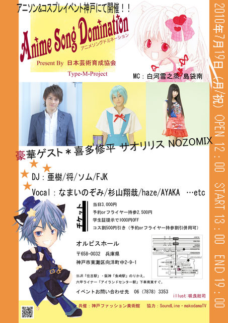 完全に忘れ去られてしまった頃にイベント開催します^^ 色々ありましたがようやく実現します イベント詳細↓ アニソン&コスプレイベント 《AnimeSongDomination》 2010年7月19日(月祝)開催 OPEN 12:00 START 13:00 CLOSE 19:00 ーGuest Live− 喜多修平 http://kitashuhei.com/index.html ーGuest DJー DJ サオリリス http://ameblo.jp/saolilith-blog/ DJ NOZOMIX(Little Non : http://www.littlenon.com/) ーDJー 亜樹 FJK 将 ソム ーSongsー