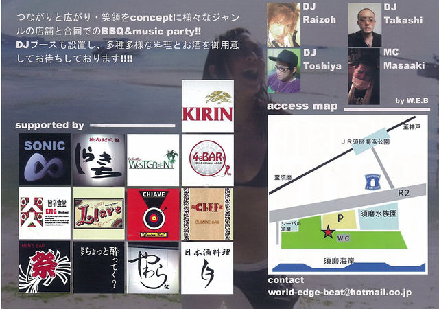 ごぶさたです。 さぁ、詳細が決まってきたのでアップしていきます! 炎とそのFriend Shopのみなさまと、そのお客さんや友達。。。 を海の日イヴにみんなで集まって〜 夏を盛り上げ、BBQでたのしくいこう!!って企画です。 今のところ、ざっと200人は越えてます。 主催は 日本酒料理 白 飲んだくれ しらきち 沖縄料理 さんや Cafe&Bar WESTGREEN 4eBAR Llave CIEF CHIAVE MEN'S BAR 祭 BARちょっと寄ってく? やわら 旨辛食堂 炎 ほか 当日、各店のFood、Drinkブース、DJブースができます。 そして、当日 朝から