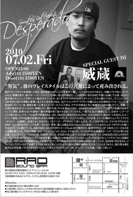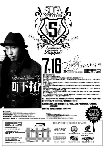 DJ : SHO-GO(漣音RECORD) / YO-KO(漣音RECORD) / SUM!(flower) / KIM(Choice92') / TATSUMI(@HOME) / YU(NIGHT FLAVOR) / LIMSHOT(STONE CRONIC)