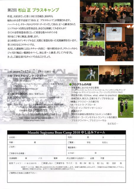 杉山 正ブラスキャンプ 2010年7月17日(土)〜19日(祝) ただ今お申し込み受付中! http://www.masashisugiyama.com/brasscamp/2010.html 昨夏、大好評だった第1回に引き続き、2010年も緑あふれる菅平高原プチホテル・ゾンタックで「杉山 正 ブラスキャンプ」が開催されます。 第2回目となるこのキャンプは、充実した講師陣によるレクチャー内容に一層の磨きをかけ、クラシックからジャズまで幅広い範囲をカバーし、初心者〜上級者、金管楽器指導者、そしてプロフェッショナルまでも、きっとご満足いただけるキャンプ