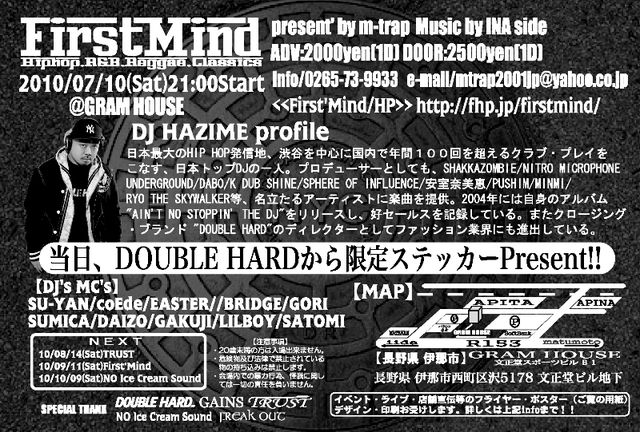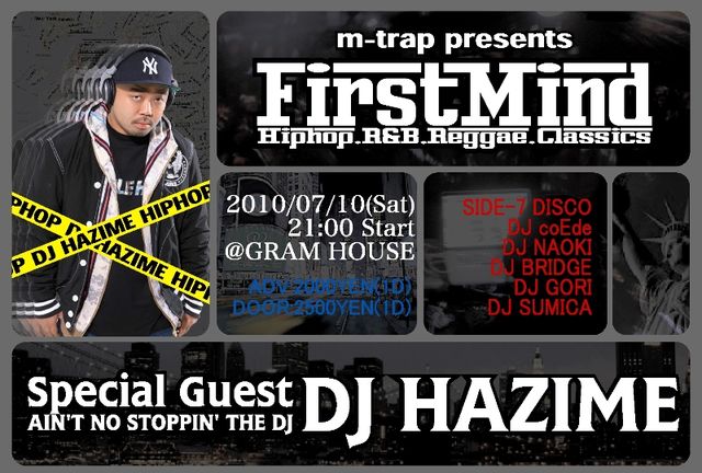 管理人様 告知失礼します。 ■2010年7月10日(土)■のFirst'Mindですが 今回もSPECIALなGUESTに参加してもらうことになりました! クラバー支持率?1っと言っても過言ではない 日本のTOP DJの1人でもある ◆DJ HAZIME◆です!! とにかくプレイバランスが絶妙です! 年間100以上のイベントをこなしているだけあって 選曲・コスリ・MIX・パファーマンス・意識の高さは 日本の代表DJで間違いないです! しかもDJ PLAYのみならず プロデューサーとしてもSHAKKAZOMBIE/NITRO MICROPHONEUNDERGROUND/ DABO/K DUB SHINE/SPHERE OF IN