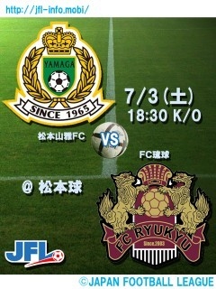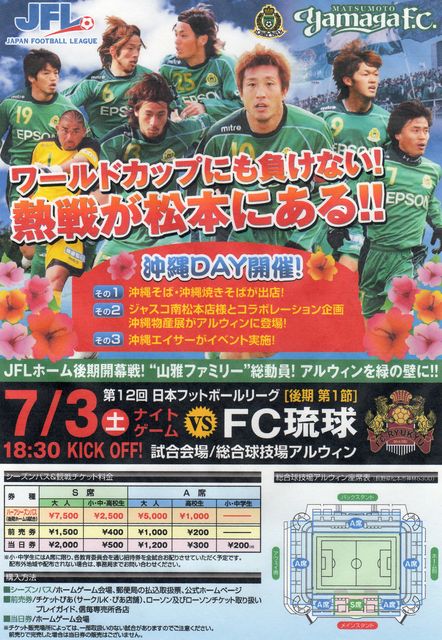 「One Sou1」 Jへの道 共に駆け上がろう! 第12回 日本フットボールリーグ 後期 第1節 松本山雅FC vs. FC琉球 2010年7月3日(日) 18:30 キックオフ 松本平広域公園総合球技場アルウィン(長野県松本市) http://www.yamaga-fc.com/ticket/categories/t006.html ◇“沖縄デー”後期第1節 イベント情報 http://www.yamaga-fc.com/news/2010/06/29/1277808574770.html [対戦成績] 1試合1勝0分0敗 [REVIEW] by JFL Official Web Site FC琉球と松本山雅FCは「沖縄北谷」で対戦。前半は互いにシュート数も少なく