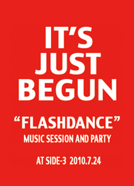 “FLASHDANCE” IT'S JUST BEGUN MUSIC SESSION AND PARTY 2010.7.24 AT SIDE-3 OPEN 21:00 1000Yen (1drink) 4-21-1『TH Building』1F Okita-machi Suwa-city Nagano 392-0013 Japan info : flashdancemusic@gmail.com blog : http://flashdance.blog.shinobi.jp/
