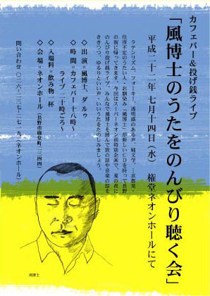 ●風博士が新しいCDを持って長野の街に帰ってきます。 今回はスーパーネオン前特別企画で、夏の夜にのんびり投げ銭ライブ。 みんなで風博士を囲んで、旅の話や、音楽の話をききつつ、 ゆるりとうたをたのしみましょう〜。 ■出演=風博士、やすみ --------- 風博士 杉山拓を中心にした音楽活動。 風博士という名前は、坂口安吾のデビュー作から。 2002年6月ごろから京都で活動を開始。 緩やかにメンバーを入れ替えながら活動を続けていたが、2008年3月京都を離れ、定住所を持たず各地を渡り歩き、ライブとCDの売り上げだけで