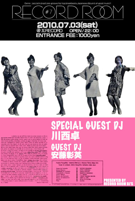 管理人様告知失礼致します。 松本のレアグルーヴシーンを引っ張る毎度お馴染みRECORD ROOM!! 7月のRECORD ROOMは、去年の大爆発も記憶に新しい、都内で大活躍中の若手No.1DJの川西卓さん、大阪の生音シーンで活躍中の安藤彰英さんを迎えてオールジャンル横断型盛り上がり度数120%の熱い一夜をお届けします。もちろんRECORD ROOM CREWも極上のサウンドで対抗します! 回を増す毎に盛り上がりと酒の量を増しているRECORD ROOM。長野県で一番熱い空間を見逃す手は無い!! Don’t miss it!! ■RECORD ROOM ♯7 【Date】7/3 SAT 22:00 s