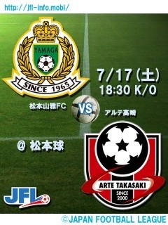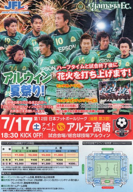 「One Sou1」 Jへの道 共に駆け上がろう! 第12回 日本フットボールリーグ 後期 第3節 松本山雅FC vs. アルテ高崎 2010年7月17日(土) 18:30 キックオフ 松本平広域公園総合球技場アルウィン(長野県松本市) http://www.yamaga-fc.com/ticket/categories/t006.html ◇“アルウィン夏祭り”後期第3節 イベント情報 http://www.yamaga-fc.com/news/2010/07/12/1278935383098.html [対戦成績] 1試合0勝1分0敗 [REVIEW] by JFL Official Web Site アルテ高崎と松本山雅FCは「浜川」で対戦。開始2分で高崎が