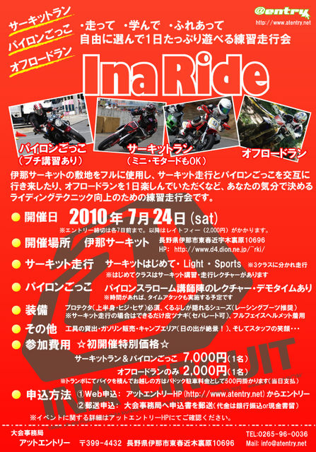 夏の信州、伊那でライテク向上走行会「Ina Ride」開催! アットエントリー(本拠地:長野県伊那市)は全てのライダーの為のライディングテクニック向上の 為の練習走行会「Ina Ride」を伊那サーキット(長野県伊那市)にて開催いたします。 詳細ページはコチラ https://www.atentry.net/ina_ride.php ■InaRideとは? 普段、ビックバイクに乗っているけれども、なかなか乗りこなせない・・・ ワインディングロードを走っていてもヒザ擦りするほどマシンを寝かせることができない・・・ 交差点でユーターンしようとしてもうまく回ること