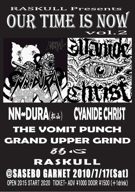 7/17(Sat) RASKULL presents OUR TIME IS NOW vol.2 @佐世保ガァネット -TICKET- ADV \1000/DOOR \1500 -TIME- OPEN 20:15/START 20:20 -CAST- RASKULL 弱心 THE VOMIT PUNCH GRAND UPPER GRIND CYANIDE CHRIST NN〜DURA(松山)