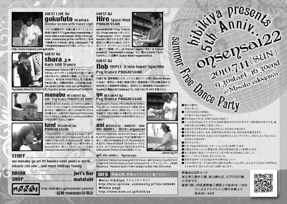 ¡ú¡ú¡ú¶Á²È¡¡²»Àôº×¡¡22FREE DANCE PARTY¡¡¡ú¡ú¡ú hibikiya presents 5th anniv onsensai22 summer free dance party ºÇ¹â¤ÎDJ¤Ç³«ºÅ¤µ¤ì¤ëhibikiya onsensai¡¡22 TRANCE,TECHNO,AMBIENT,ElectroHouse, minimal techno with trance style MUSIC& LIVEPAINTING -Date/Place- 07/11¡¡sun¡¡2010 saitama misato edogawa nagareyamabasi¡¡²¼Î® map:http://www.mapion.co.jp/here/all/100614/mapi0101407100614185002.html -ACCESS- ºÇ´ó¤ê±Ø¡¦¡¦¡¦JRmusasinoline misatostation tukubaeEXPRESSline misatochuou misat