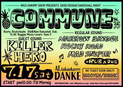 COMMUNE VOL.35 2010/7/17/SAT @高岡DANKE NO TICKET DOOR ONLY 1500YEN/1DRINK START 22:00- Music by... KILLER HERO fr.石川 NARROW BRIDGE ROCKY ROAD MAD SNIPER Sound System WILD SHRIMP 今回は直球勝負、FOUR SOUND NIGHT決行!! 年代関係なしのその日のフロア盛り上げモン勝ち!! イイ時間には呉西エンターテイナーのラバダブもあり!! 楽しみたいならコミューンへ!!