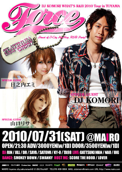 2010/07/31(土) @MAIRO FORCE+Prutinum Cherry OPEN/21:00 ADV:\3000(w/1Drink) DOOR:\3500(w/1Drink) SPECIAL GUEST: DJ KOMORI / 日之内エミ / 山口リサ DJ: RIN / JILL / DR / SAYA / SATOMI / KY-O / TA98 LIVE: GATTSUKI MAN / NAO / IIIG DANCE: SMOKEY DOWN / SWANKY