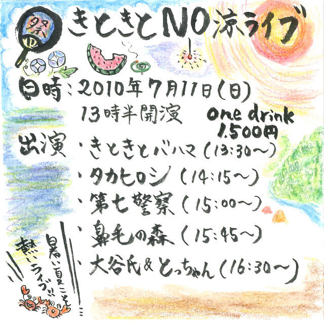 今週末、日曜に高岡市戸出でのイベントに鼻毛の森が出演します。 オムニバスライブとしては長めの出演時間なので、MCもたっぷり楽しめることでしょう。。。たぶん、きっと、おそらく。 ◆夏バケ! summer art 2010◆ 7月11日(日) 『きときとNO涼ライブ』 場所:高岡市オフィスパーク5番地 富山県産業高度化センター1F tel:0766.62.0580 時間:13時半開演 1drink 1500円 出演順:きときとバハマ、タカヒロシ、第七警察、鼻毛の森、大谷氏&とっちゃん 主催:GALLERY・ガラスのピラミッド ・(株)富山県産業高度化センター http