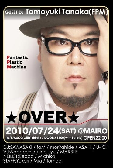 7/24 (SAT) ☆OVER☆ @ MAIRO OPEN 22:00〜 GUEST DJ : 田中知之(Fantastic Plastic Machine) http://www.fpmnet.com/ ■ DJ : SAWASAKI / faM / moritahide / ASAHI / U-ICHI ■ VJ : Abbacchio / inp...yu / MARBLE ■ NEIRIST : Reaco / Michiko ■ STAFF : Yukari / Miki / Tomoe adv 3,000yen (with 1Drink) with flyer 3,000yen (with 1Drink) door 3.500yen (with 1Drink) 先着50名様にDJ ASAHI mix CDプレゼント!! この日の☆OVER☆はMINORITYではなく半年ぶりにMAIROで開催します ゲストにはハウス界