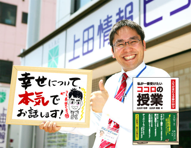 ども これまでのイベントとは、全然カラーが違いますが、 俺の尊敬する先生の講演会を開催することにしました〜〜イェイ その尊敬する先生ですが、 「比田井和孝」さんとおっしゃいます。 で、肝心の比田井先生がどんな人かということですが、 私のつたない説明よりも、まずは下記のWebページをご覧ください。 http://www.uejobi.ac.jp/special/kokoro/index.html 普段は、長野県で専門学校の副校長をされている比田井先生ですが、 生徒に幸せになってもらいたいという一心から、 生き方についての授業