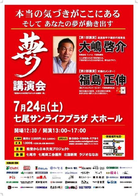 日時:7月17日(土)19:40〜21:20〔100分〕 場所:ANAクラウンプラザホテル富山 5F 全天候型ガーデンテラス 〔住所〕富山市大手町2-3 〔TEL〕(076)495-1111←ナビ利用の方はこの番号を入力してね! 〔URL〕http://www.anacrowneplaza-toyama.jp/ 会費:4,000円 ご家族の参加OKです。中・高校生〜20歳未満:3,000円、小学生:1,000円 <地図> http://map.yahoo.co.jp/pl?lat=36.691592318624&lon=137.21193193342&z=16&mode=map&pointer=on&datum=wgs&fa=ks&home=on&hlat=36.691592318624&hlon=137