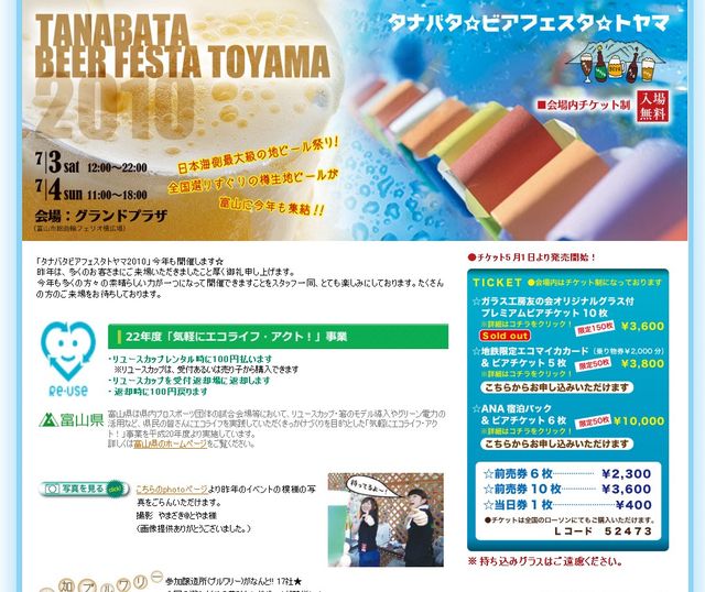 こんにちは、キングビアリストです 来月の7月3日、4日に富山で開催される 【タナバタ☆フェスタ☆トヤマ2010】 http://www.beerfesta-toyama.jp/ このイベントに大阪からバスをチャーターして1泊2日で 行ってしまおうというツアーを企画しました! 詳細は私までメッセージをいただけましたらご連絡いたします! ぜひみんなでわいわい騒ぎながらビアフェスに参加して 最高の週末を過ごしませんか 募集人数残りあと5名です!! ご応募お待ちしております