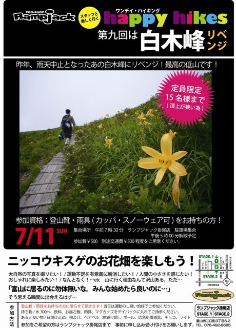お待たせしました! ワンデイハイク開催のお知らせです。 【開催日】7月11日(日) 今回は少し意気込みが違います。 なぜなら… 昨年は雨で行けなかった、白木峰だから! リベンジマッチです。 今回の舞台は、富山県と岐阜県にある山「白木峰」。 山頂にはニッコウキスゲの群生地があり、その中に木道が通っています。 黄色いお花畑の中を歩くのは最高の癒しですよ! 山頂が少し狭いので、定員は15名様までとさせていただきます。 参加希望の方は、掛尾店にて事前申し込みが必要です。 (定員になり次第、受け付け