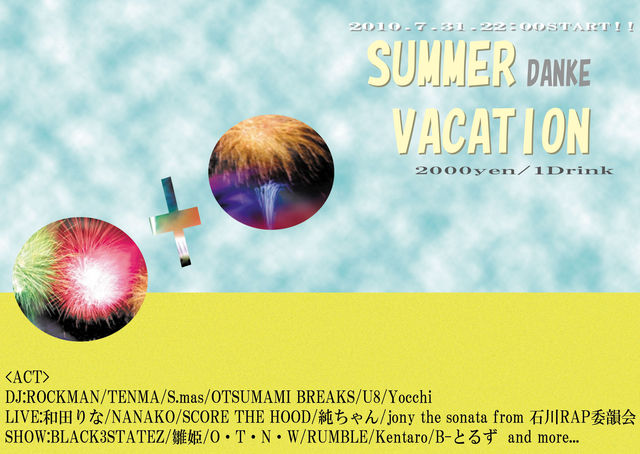 『o+o -Summer Vacation-』 2010/07/31(sat)@DANKE OPEN/START 22:00 2000yen/1Drink キャッシャーにて 出演者の名前を言っていただくか フライヤーや提示していただくか Mixiで見たと伝えていただけると 先着50名様に Oto Sae Areba...Summer Vacation 2010 をプレゼント致します!! [DJ] ROCKMAN TENMA S.mas OTSUMAMI BREAKS U8 Yocchi [LIVE] 和田りな NANAKO 純ちゃん jony the sonata from 石川RAP委韻会 [SHOWCASE] BLACK3STATEZ 雛姫 O・T・B・W RUMBLE Kentaro B-とる