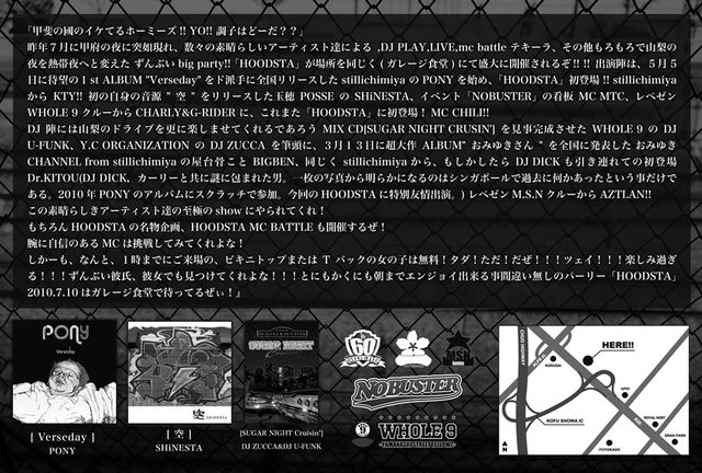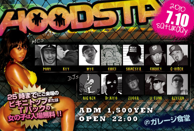 告知失礼します!! 「HOODSTA」 @ガレージ食堂 2010.7.10(Sat) OPEN/22:00 ADM/\1500 (25時までにご来場のビキニトップまたはTバックの女の子は入場無料!!) [LIVE] PONY from.stillichimiya KTY from.stillichimiya MTC CHILI SHiNESTA CHARLY G-RIDER [DJ] BIG BEN from.stillichimiya/おみゆきCHANNEL Dr.KITO from.stillichimiya ZUCCA U-FUNK AZTLAN 「甲斐の國のイケてるホーミーズ!! YO!! 調子はどーだ??」 昨年7月に甲府の夜に突如現れ、数々の素晴らしいアーテ