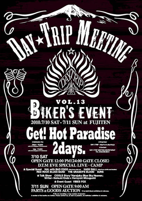 管理人様 バイカーズイベントの告知ですが不適切で有れば削除をお願い致します。 いよいよ7月10日(土)11日(日)とFUJITENスノーリーゾートにてDAY☆TRIPmeetingVoI 13を開催致します、13回目という記念すべき不吉な数字、DAY☆TRIPmeetingに相応しい数字です!! と言う訳で今年は記念パッチ付きで入場料キャンプ代込み2DAY、2.500円 1DAY、1.500円(両日パッチ付き)です、グッズ販売、飲食ブースも約80店舗出店予定! 観て回るだけでも楽しめます! ステージでは、お馴染みHASH BALL、RED ROCK BLUSE BANDをはじめSpecial Guestに元C