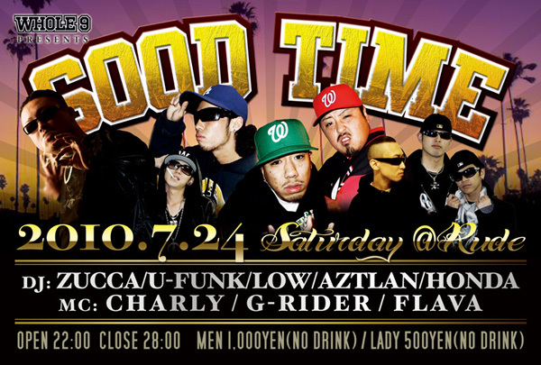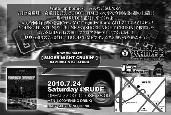 Watts up homies! みんな元気してる? 7月は奇数月! 奇数月と言えばGOOD TIME! って事で今回も第4週の土曜日! 場所はRUDE! 絶対に来てくれよ! しかも今回は山梨の老舗Crew Y.C OrganizationからDJ ZUCCAがスピン! [YOUNG HUSTLIN]やU-FUNKとの[SUGER NIGHT CRUSIN]で披露した 高いSkillと独特の選曲でフロアを盛り上げてくれるぜ!! 夏真っ盛りの7月24日! GOOD TIMEでオレたちと熱い夜を過ごそう! って事でみんなで遊びにこーし!!!