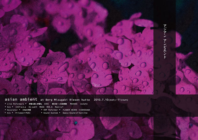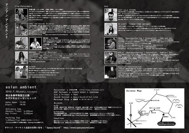 SPACY SOUND present asian ambient 2010.7.10(Sat)-11(Sun) GateOpen15:00 MUSIC 18:00 @ 秩父多摩甲斐国立公園みずがき山リーゼンヒュッテ http://www.masutominoyu.com/index.html * Live Performers * 伊藤 公朗 シタール奏者Duo http://www.anjalimusic.jp/ 伊藤 礼 http://gaia-song.jugem.jp/?eid=267 Cari(Artmonde Studio) Electric&Accoustick Guiter http://www.myspace.com/rareunderground 関口祐一 サロード奏者 インド音楽Duo 石田詩織 タブラ奏者 http://www.youtube.com/watch