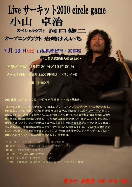 ライブを企画している座長です。 久々の、山梨ライブになります。 高部座といっても俺家の座敷なんですが(キャパ80くらい) 都会では味わえない雰囲気で、ライブを楽しんで貰えたらと思ってます。 そして今回は、河口修二さんがギターで参加してくれるので、これまた楽しみです。 山梨は遠いイメージあるかも知れませんが、車だと、中央道をかっとばし 談合坂サービスエリアで一息ついても、新宿から1時間半あればこれますので 、遠方の方も大歓迎です。 詳細は小山さんのHP見てください。