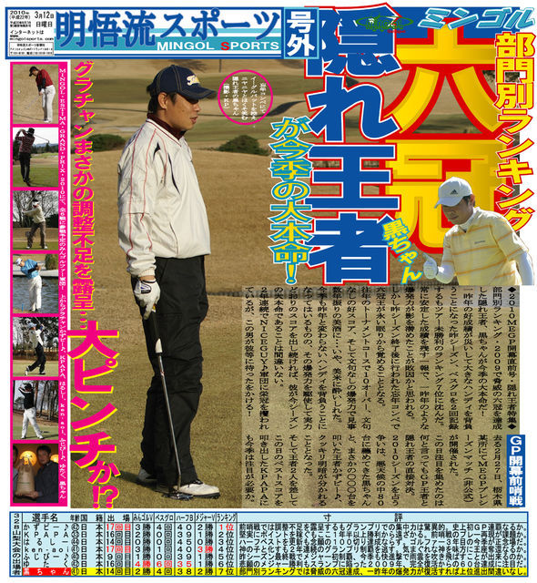 ↑注目(爆爆爆) 部員も順調に増えているお月様友の会 『お月様チャンピオンシップ』も、序盤戦の山場を迎えているコトでしょう さー、さー、さー、さ− 今月もオトクにお安く、プレーしちゃいましょう 【日程】 2010年7月11日(日) 【場所】 山梨県 大月ガーデンゴルフクラブ 【時間】 暑い時期なので、早めにしてみまシタ OUT 7:16 7:24 7:32スタート IN 7:16 7:24スタート 【参加人数】 5組20名まで。 【参加費用】 年度会員 7,300円(昼食別)