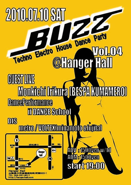 くまメロライブじゃないのにトピ立て失礼しますm(_ _)m 2008年の12月以来、1年7ヶ月ぶりに入倉もん吉ソロでライブ出演します。 とにかく楽しく思いっきり踊りたい人は是非遊びに来てください。 僕も全力で楽しむつもりです。一緒に遊びましょう! 前売りだとドリンク付きで1500円だからお得ですよー。 BUZZ vol.04 Date: 10,JUL,2010 Place: Hanger Hall 山梨県中巨摩郡昭和町河西622-1 http://hangarhall.com GUEST LIVE : Monkichi Irikura (BESPA KUMAMERO) DJs : VOLTEX(Minamoto , Fujita) , metro Start: 19:00 adv