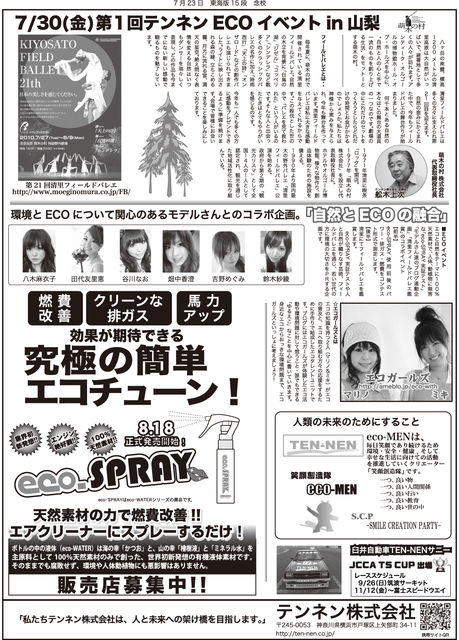 ■私達は社名からもお分かりになるとおり人や環境に優しい商材を扱っております。 2010年7月30日(金)に、エコ・自然をテーマに、読者モデルさん達とのドライブイベント、大自然の中で行う「清里フィールドバレエ」の鑑賞 等 (詳細はお問い合わせ後にご案内致します。) ◆テンネン←eco-SPRAYで環境と燃費に配慮。 http://www.ten-nen.co.jp/ エコドライブや萌木の村でエコや自然を体験し、それをツイッターやブログで若い世代に対し環境の大切さをPRする。 ◆清里フィールドバレエ←自然と融合したアート。 http://www.moeginomur