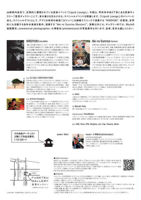管理人様 イベント告知失礼いたします。 リキッドラウンジ・真夏のスペシャルイベント! Chill Out Summer 2010 のお知らせ !! 山梨県内各所で、定期的に展開されている音楽イベント「Liquid Lounge」 7月24日(土曜日)に古民家ギャラリーにて夏の暑さを忘れさせる、スペシャルイベントを開催いたします。 「Liquid Lounge」のメンバーに加え、スペシャルゲストとして、都内からアフリカ発祥の楽器「カリンバ」を 超絶