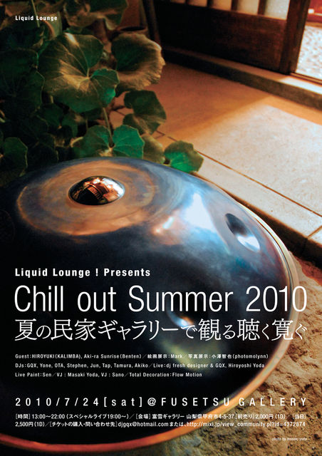 管理人様 イベント告知失礼いたします。 リキッドラウンジ・真夏のスペシャルイベント! Chill Out Summer 2010 のお知らせ !! 山梨県内各所で、定期的に展開されている音楽イベント「Liquid Lounge」 7月24日(土曜日)に古民家ギャラリーにて夏の暑さを忘れさせる、スペシャルイベントを開催いたします。 「Liquid Lounge」のメンバーに加え、スペシャルゲストとして、都内からアフリカ発祥の楽器「カリンバ」を 超