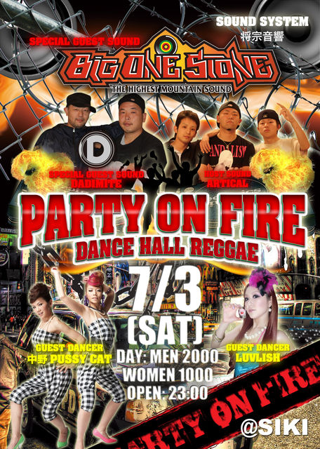 ...ARTICAL PREZENTS... ■PARTY ON FIRE■ 2010.7.3(土) @土浦 SIKI DAY:MAN/2,000 WOMAN/1,000 OPEN/23:00〜 【GUEST SOUND】 ◯BIG ONE STONE fr.千葉 ◯DANDIMITE fr.YARD 【GUEST DANCER】 ◯中野PUSSY CAT ◯LUVLISH 【SOUND SYSTEM】 ◯将宗音響 【HOST SOUND】 ◯ARTICAL