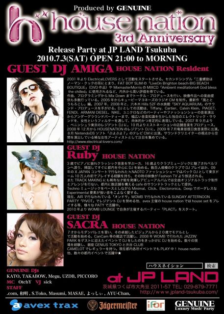 管理人様、告知失礼いたします。DJ AMIGA出演イベントです!!!!! 次回のGENUINEは、7月3日(土)!!HOUSE NATION から、「DJ AMIGA」「DJ Ruby」「DJ SACRA」の3人のDJをゲストに迎えて、HOUSE NATION 3rd Anniversary リリースパーティを開催します!HOUSE NATIONを代表する3人のFemale DJが集結で、新生「JP LAND TSUKUBA」初、ハウスミュージックのビッグパーティーになります! HOUSE NATION TSUKUBA は、つくばに新規OPENした「JP LAND」で初開催! 今回はHOUSE NATIONから豪華3名のGUEST DJが来場! 進化を続けるパーティーをGENUINE