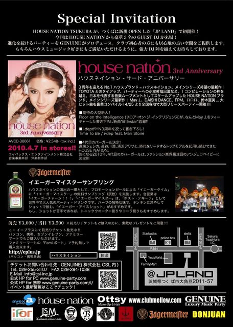 管理人様、告知失礼いたします。 次回のGENUINEは、7月3日(土)!!HOUSE NATION から、「DJ AMIGA」「DJ Ruby」「DJ SACRA」の3人のDJをゲストに迎えて、HOUSE NATION 3rd Anniversary リリースパーティを開催します!HOUSE NATIONを代表する3人のFemale DJが集結で、新生「JP LAND TSUKUBA」初、ハウスミュージックのビッグパーティーになります! HOUSE NATION TSUKUBA は、つくばに新規OPENした「JP LAND」で初開催! 今回はHOUSE NATIONから豪華3名のGUEST DJが来場! 進化を続けるパーティーをGENUINEがプロデュース。クラブ初心者